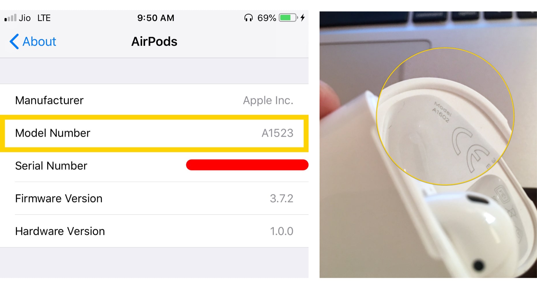 The model number inside the lid of the charging case and what is shown on the connected iPhone under Settings → General → About → AirPods are different.
